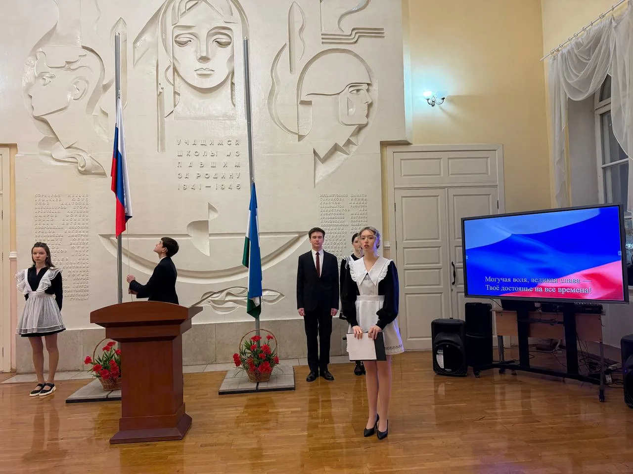 Учебная неделя в гимназии началась с торжественного поднятия флагов Российской Федерации и Республики Башкортостан.