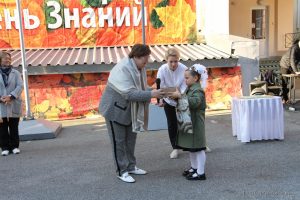 Особыми гостями на линейке стали наши первоклассницы – Гаврилова А. и Талипова Р. Директор гимназии Ю.Ф. Вяткина с радостью вручила им подарки от главы города, символизирующие начало их школьного пути. А ученица 2 класса Ямлиханова А. получила заслуженную награду – значок «Мой папа-герой», как знак признания и гордости за своих родителей.