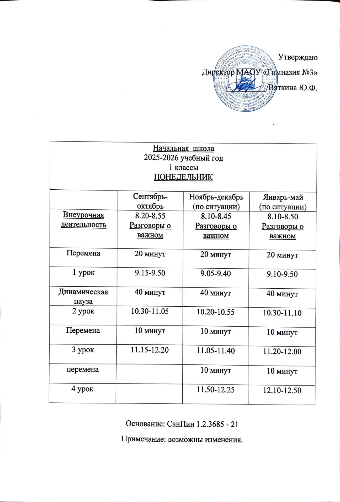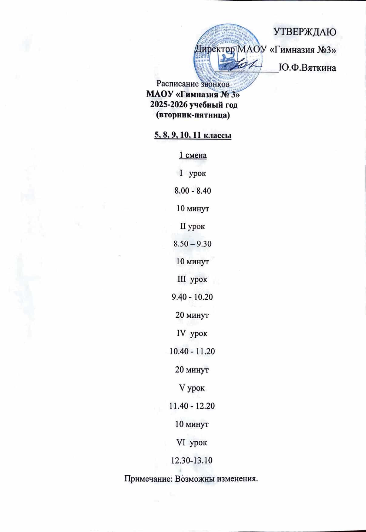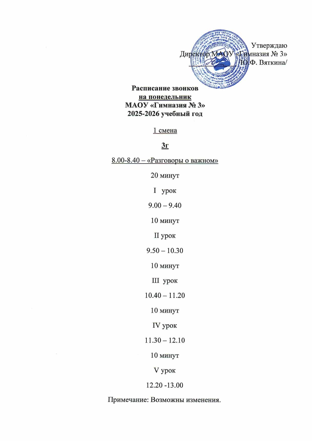 Расписание звонков МАОУ «Гимназия №3»