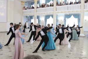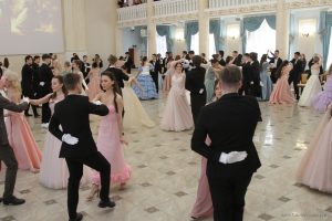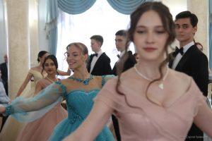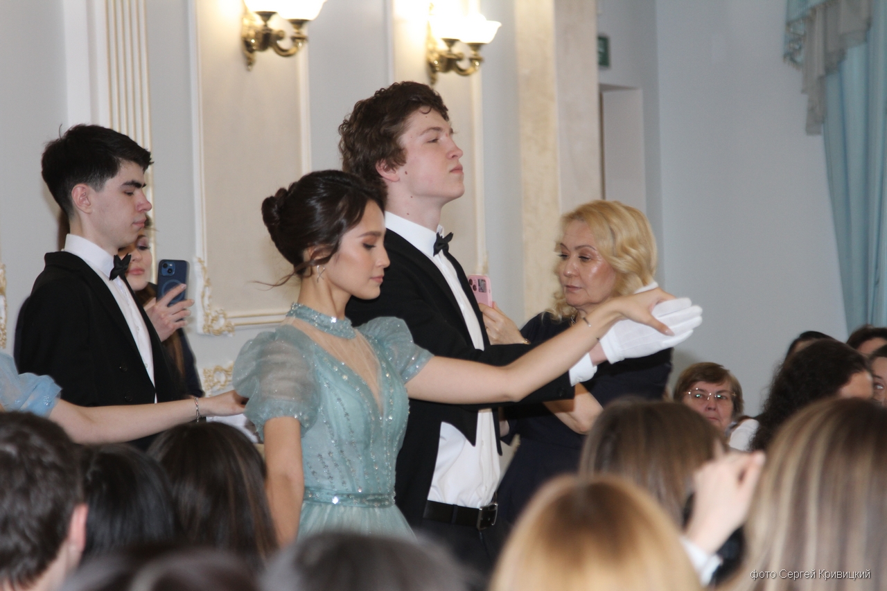 Девушки в роскошных бальных платьях, словно ожившие картины прошлого, кружились в танце. Юноши в строгих фраках, держа партнёрш за руки, вели их в ритме танца, создавая атмосферу благородства и утончённости. Каждое движение было исполнено грации и достоинства, будто время остановилось, чтобы подарить мгновения вечности.